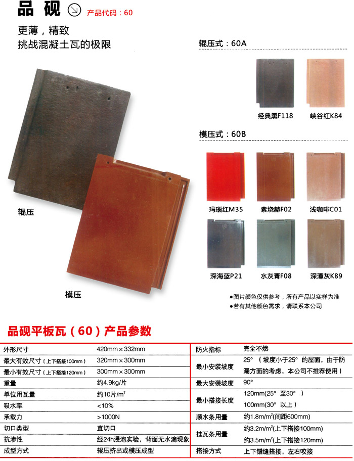 1.顏色耐久度風刮風吹日曬、淋雨不退色。一些小型加工廠因設備簡陋、技術性不合格,沒法將混凝土珠光粉噴漆勻稱一致,而用漆料噴色。這類瓦在很短期內內亮皮即掉下來,露了底,斑斑駁駁十分不好看。